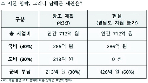 한 군의원은 "지금은 당초 계획대로 국비 80%, 지방비 20% 수준으로 다시 조정하는 데 노력해야 한다"면서 "그렇지만 이같은 조정 없이는 남해군의 현 재무구조상 경남도의 지원 없이는 남해군 자체 재원만으로 213억원도 버거운데, 426억원을 감당할 수 없다는 사실을 군민들에게도 객관적으로 알려야 할 의무가 있다"고 말했다.
