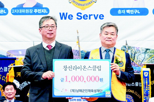 남해군은 지난 1일 창선면생활체육공원에서 열린 국제라이온스협회 355-E지구 제19회 하동·남해 지역대회에서 창선라이온스클럽(회장 황구월)이 이웃돕기 300만원과 인재육성기금 100만원을 기탁했다고 밝혔다.