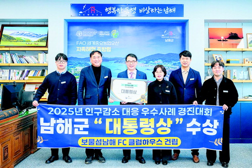 남해군이 행정안전부가 주관한 '2025년 지자체 인구감소 대응 우수사례 경진대회'에서 최고 우수 기초지자체로 선정돼 대통령상을 수상하는 영예를 안았다.