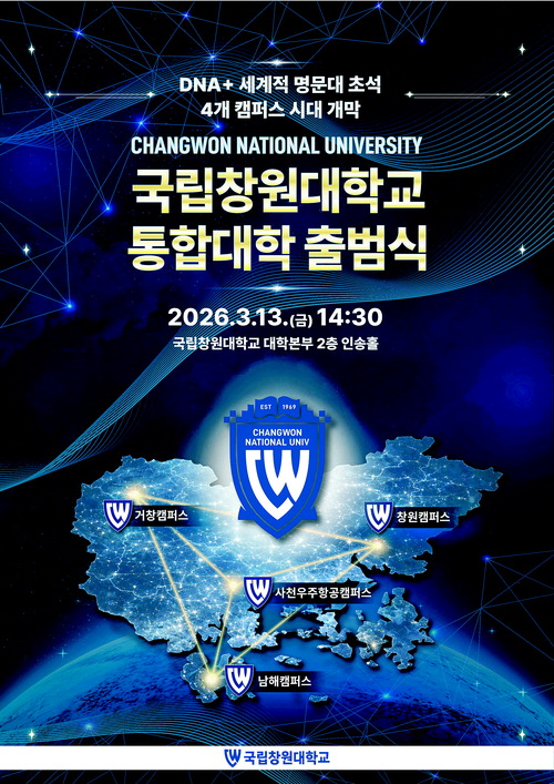 국립창원대학교(총장 박민원)가 경남도립거창대학·경남도립남해대학과의 통합을 통해 창원·거창·남해·사천 4개 캠퍼스 체제를 완성하고, 13일(금) 오늘 대학본부 인송홀에서 '국립창원대학교 통합대학 출범식'을 개최한다.
