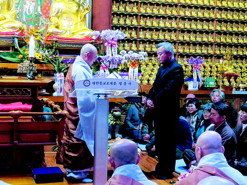 | ▲ 남해불교사암연합회 회장 승원스님이 불교연합신도회 하청두 회장에게 임명장을 전달하고 있다. |