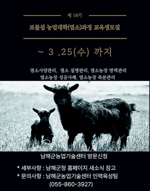 남해군농업기술센터가 남해 축산업을 이끌어갈 전문 축산인 양성을 위해 오는 3월 25일(수)까지 '2026년 남해군 보물섬농업대학 축산(염소) 과정 교육생을 모집한다.