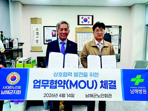 사)대한노인회 남해군지회(지회장 정문한)는 지난 14일 남해군노인회관에서 남해병원(병원장 장명세)과 '지역 어르신 의료복지 향상을 위한 업무협약(MOU)'을 체결했다고 밝혔다. 이날 협약식에는 정문한 지회장과 사무국장, 남해병원 강순철 행정원장을 비롯한 양측 관계자 5명이 참석해 지역 어르신들의 건강 증진을 위한 긴밀한 협력을 약속했다.